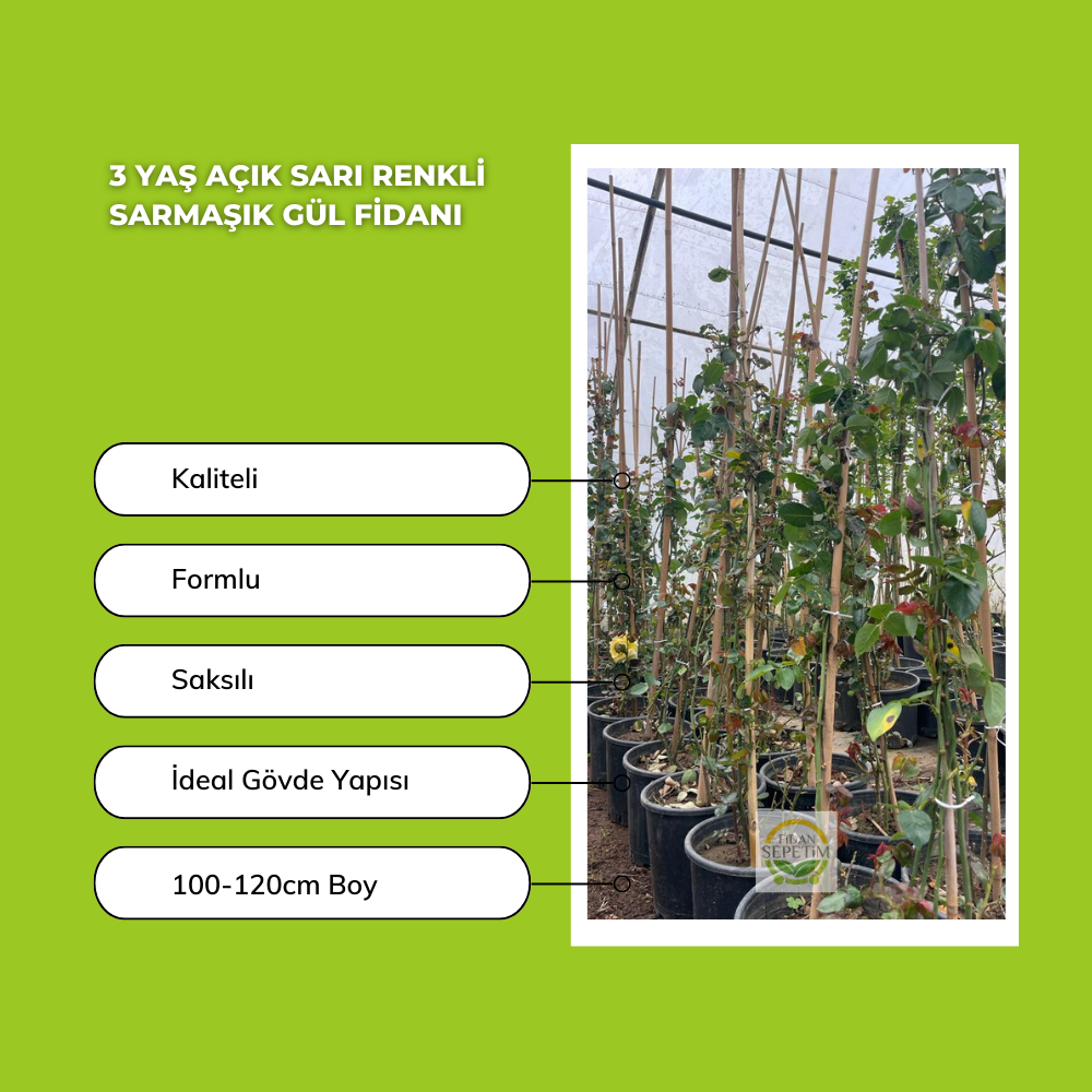 Bitki Cins/Çeşit Özellikleri3 Yaş Açık Sarı Renkli Sarmaşık Gül FidanıGoncaları açık sarı renklidir.