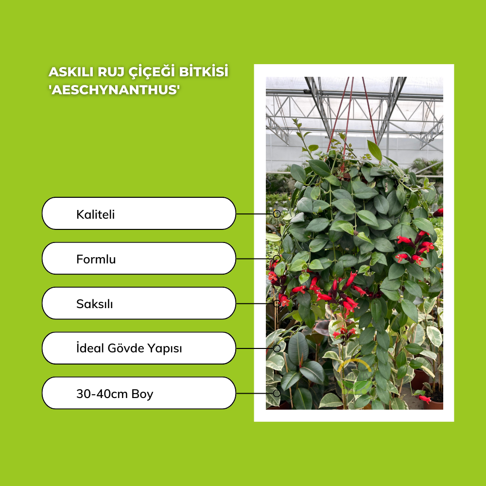 Kalın, parlak yeşil yaprakları ve canlı kırmızı çiçekleriyle her mevsim göz kamaştıran bu bitki, askılı saksısıyla hem şık hem de pratik bir çözüm sunar.